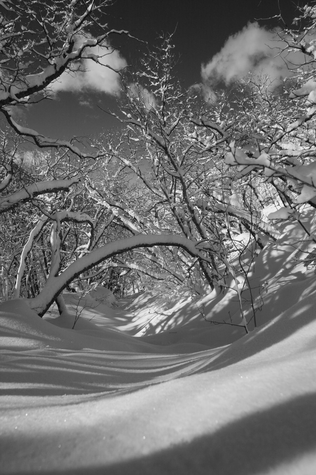 I drive the few miles to the canyon, watching the sun creep slowly down it’s side. Once on the trial I quickly find my subject with the Scrub Oak’s gangly branches piled with pristine powder, and the blank canvas that is the rolling terrain. This is the first time I have taken my camera out in months. Shooting in black and white I hope to obtain a classic feel, but I am struggling to just remember how to get the right exposure for snow. For the next few hours I move among the trees, capturing the scene from various angles and view points.