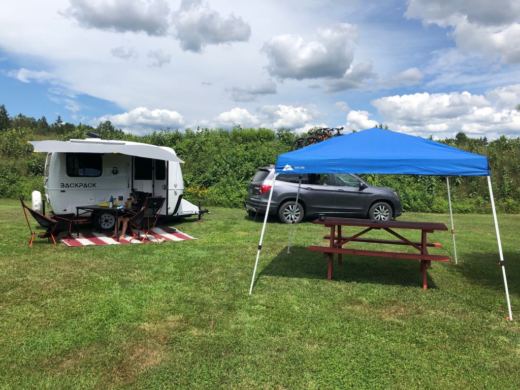 We’ve had a few spicy moments both with Marshmellow and as a family on this trip. The latter is normal, and any family who tells you they don’t bicker after living a week in a fourteen foot Marshmellow is a liar. The charging of the battery and the solar are so confounding that Erin and I go in circles trying to figure it all out. At least on this trip we have not run out of power–we wisely got a generator because, surprise, it is not always sunny in Vermont. We did completely drain the battery on our last trip here. That little snafu forced us to go to an RV park, which caused Erin to cry because RV parks are not where we want to stay, no matter how nice the pool is. It poured one night this week, at just the right angle, and one of the windows leaked. One morning in our haste to ride we did not take down the awning and returned to find that the awning and the poles had twisted themselves into a pretzel. The awning is still usable and the water dried so we keep plodding on (KPO).
