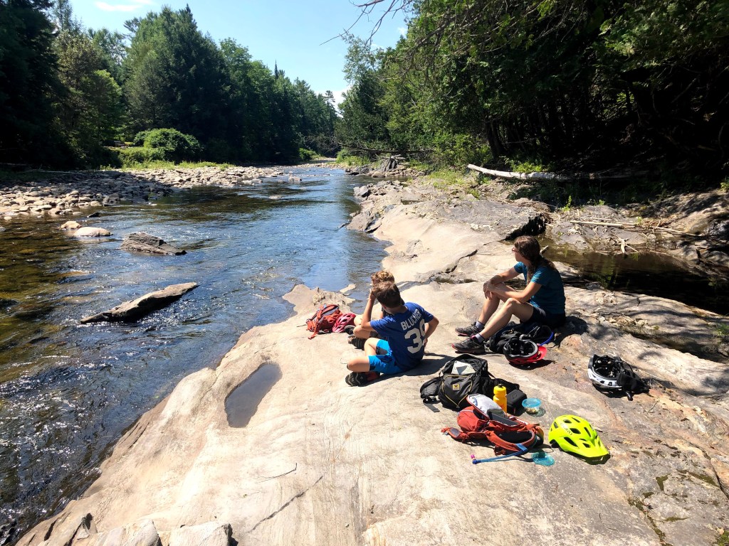 When we get there Erin and Noah disappear down one trail while Luke and I debate which of the three trails to take. We take a different trail, wrongly assuming that the trail Erin took will link up with the one we take. When we reach another intersection Erin and Noah are not there and I realize the trail they took is not on any map. Leaving Luke munching on cashews and M&Ms I ride back to where we split up and ride down the trail they took, eventually coming to another intersection of three trails. Technology got us into this mess but it also gets us out when I call Erin and figure out where they are. Once we are reunited, the boys take us to their bike camp snack spot along the river. While we’re reclining on the smooth warm rocks listening to the river tumble past munching on our snacks, Luke nonchalantly says. “Sasquatch is just a rodeo clown gone rouge.” Then he goes back to eating his snack.