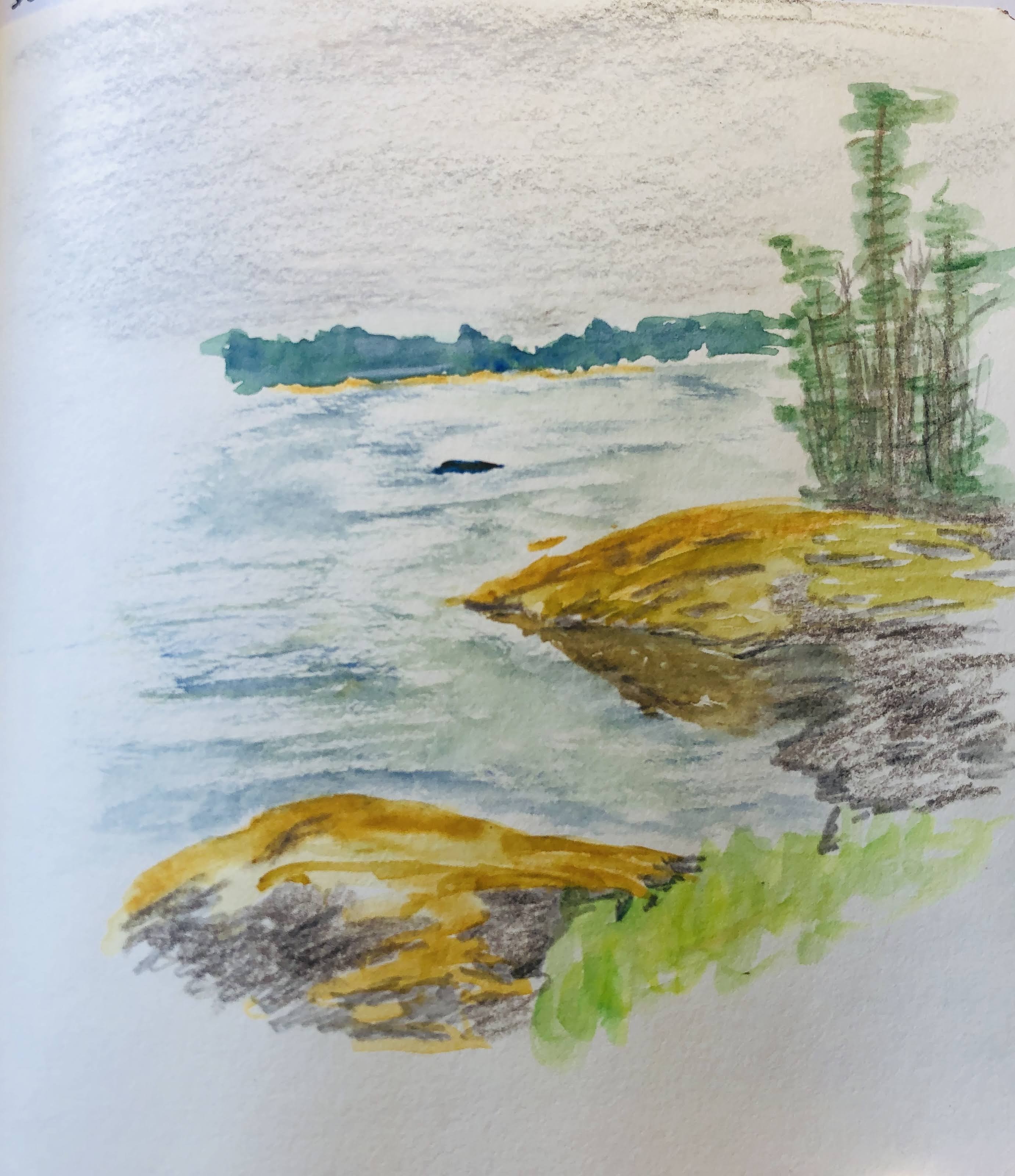 Our campsite, number six, is one of a handful of first-come sites in the park that are right on or near the water. Our site can accommodate an RV up to thirty-five feet, over twice the size of Marshmellow. With such a large site and the easy maneuverability of Marshmellow, we spend two hours trying to find just the right spot to park for the week. I pull forward, back-up, get out and stand with my hands on my hips while conferring with Erin, then repeat the process several more times. Exasperated with our indecision, the boys wander down to the shore where they find a bone that looks like a miniature whale’s tail. Finally, we tuck Marshmellow in between the trees, angled just right so we can see the water through the big back window.
