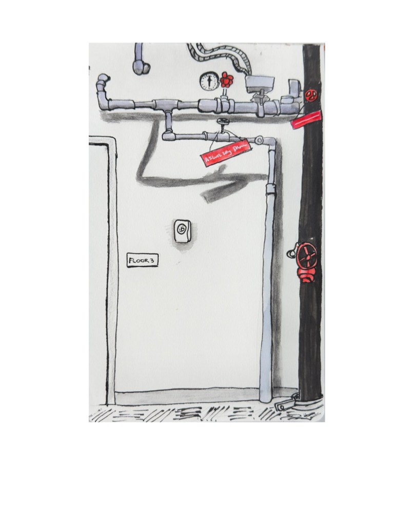 Having spent enough time sitting yesterday, I wandered the halls and the adjacent parking lots of the hotel. On the way back to the room, I opted to skip the elevator and take the stairs; where I discovered there is a beauty in the utilitarian simplicity of pipes. I looked at the pipes for a moment noticing the contrast of the black and red, the signs hanging. It was a work of art in the corner. I thought about taking a picture and going back to the room to draw it. Then dismissed the idea, why draw from a picture when I could draw from the real thing. I went to the room to grab my sketchbook. The stairwell was not conducive to art making and I quickly realized that in dim light I really needed my reading glasses. However, all my art is a semi-true story so I took the slightly blurry page as an extra challenge and continued; though I inked and colored the drawing back in our room under better lighting conditions. I like the way it turned out. A good reminder that there is an interesting beauty in the utilitarian, if we just take a moment to see it.