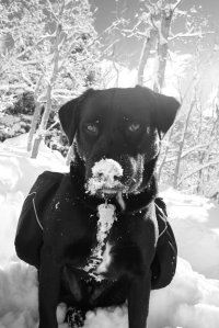 We have had our dog, Leunig*, a black lab mix for almost three years now. We picked him up from the Humane Society one sunny afternoon in November. When we got Leunig, Erin was in her second year of residency so I was spending a fair amount of time alone while she worked insanely long hours. It was great to have someone to greet me when I came home and to hang out with even if he had four legs and did not talk back to me. We took long walks through dark streets in the mornings before I went to work, when I came home we often escaped to the mountains usually to the “Snow Hut” a fort some friends and I had built in one of the canyons. On the occasion that Erin was home and not sleeping, we planed our hikes in the areas Leunig could go, avoiding the watershed canyons like the plague. We took him camping in the High Unitas where he slept in the tent with us. At times I would bring him into the office where he would spend the days laying on the floor happily snoring away as I worked. We skied less at the resorts and went snowshoeing more. Many times on winter nights I would load my skies and Leunig into the car and we would head up to Mill Creek Canyon for a quick skin, he quickly learned to stay away from my ski tips and tails, running ahead of me on the climb up and behind me on the way down. I found a light to attach to his collar because at night in the canyon he disappeared into the darkness. He even had his own backpack.